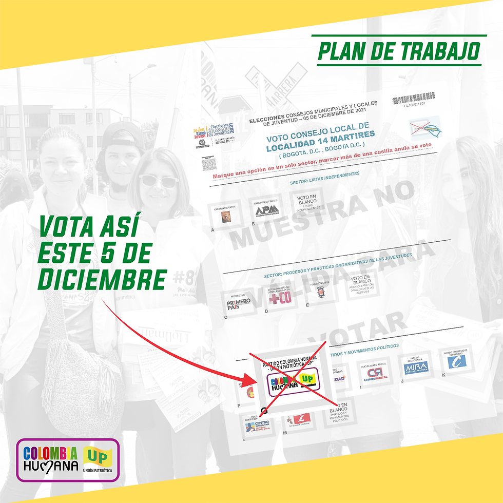 El próximo domingo 5 de diciembre en las elecciones a los Consejos Locales de Juventud, les invito a votar por la Colombia Humana - Unión Patriotica. #JovenEligeJoven